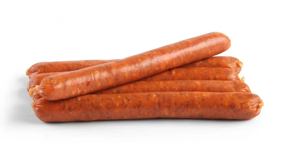 Tilltuggskorv med naturskinn och högt köttinnehåll (>95%). Passar bra som tilltugg eller meze. - Ingredienser: griskött, koksalt, kryddor, socker, vitlök, kryddextrakt, konserveringsmedel E250. antioxidationsmedel E316, paprikaextrakt.